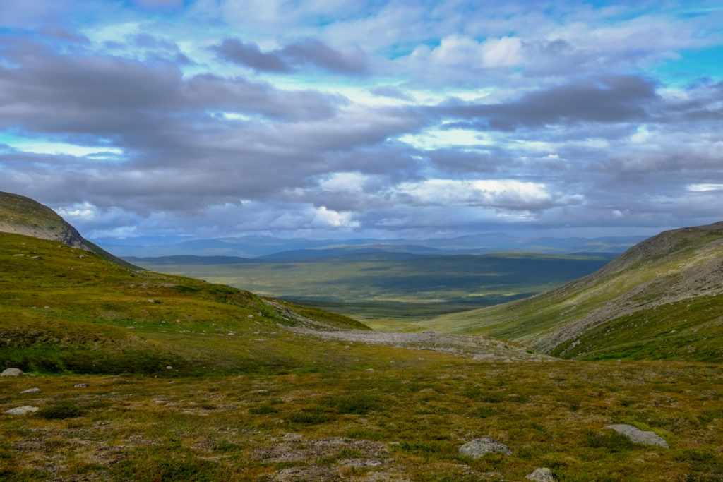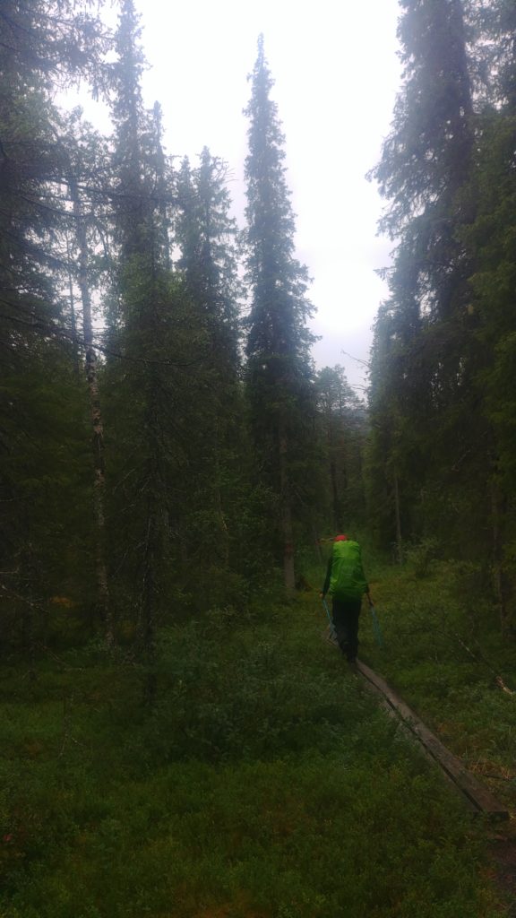 På andra sidan märks det omedelbart att vi nu är på den minst populära sträckan på leden då stigen är just det; en liten skogsstig, istället för de meterbreda upptrampade landsvägarna som den förvandlats till några mil norr upp. De första 4km är en brant terrängtrappa med ojämna, för stora och rejält hala trappsteg från nattens och morgonens regnväder. De där 21kg på ryggen känns snarare som 210kg och det fullkomligt brinner i benen och lungorna när vi äntligen kommer upp på platt mark efter 1,5 timme där vi tar en paus.