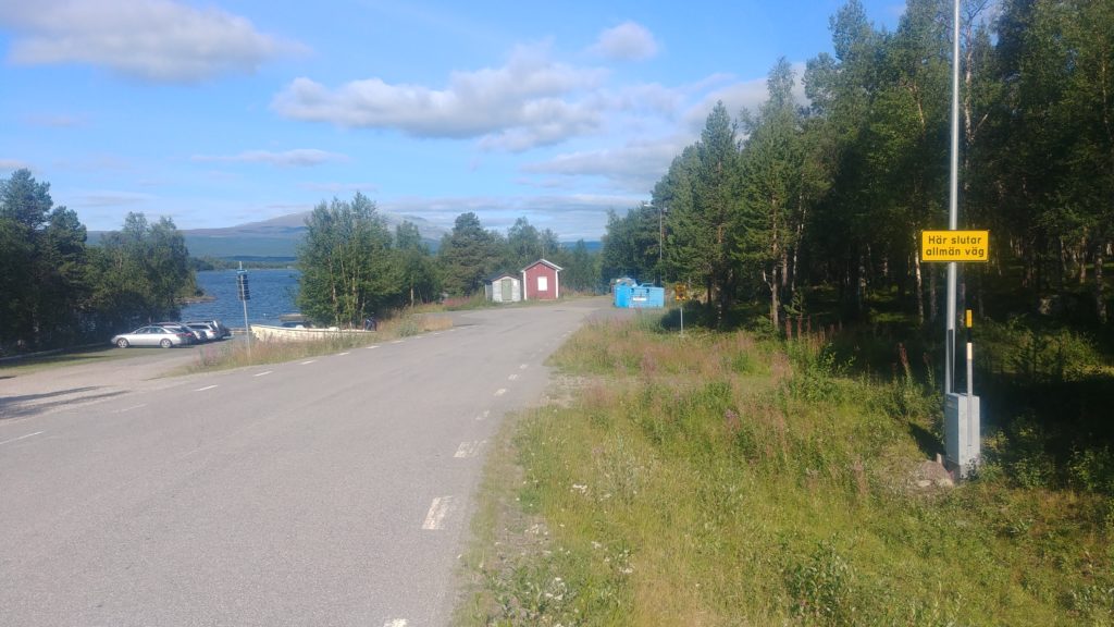 Där leden fortsätter in i skogen tar också vägen slut vilket indikeras av en riktig vägskylt som läser ”Här slutar allmän väg”, så om det är någon som sökt efter vägens ände kan jag meddela att den ligger i Adolfsström, vilket man nästan kunnat gissa sig till om man besökt ”orten”. Stöter på en övre medelålders man i Bäverholmen som ligger 5-6km efter Adolfsström. Ölmagen spänner ut trycket på hans T-shirt som läser ”I would flex but I like this shirt” med en bild på hulken som håller upp texten. Han berättar om hur han brukade gå till Jäckvik varje dag när han jobbade där. Han sa det inte rakt ut men jag är rätt säker på att det var motvind och uppförsbacke åt båda håll.