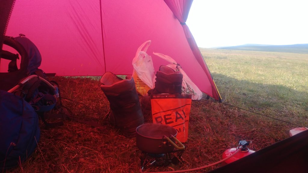 Jag slår upp tältet några timmar senare på en platå vid en stor bäck och lagar mat medan jag reflekterar över att detta är första natten helt ensam i naturen. Ingen annan på säkert 1-2 mil i alla riktningar och det känns lite konstigt. Jag brottas med obehagskänslor under kvällen och har svårt att sova. Det är första gången på hela resan som jag verkligen längtat hem och lite oväntat känner jag nu att jag ser fram emot att komma fram till Ammarnäs för att se och prata med folk igen.