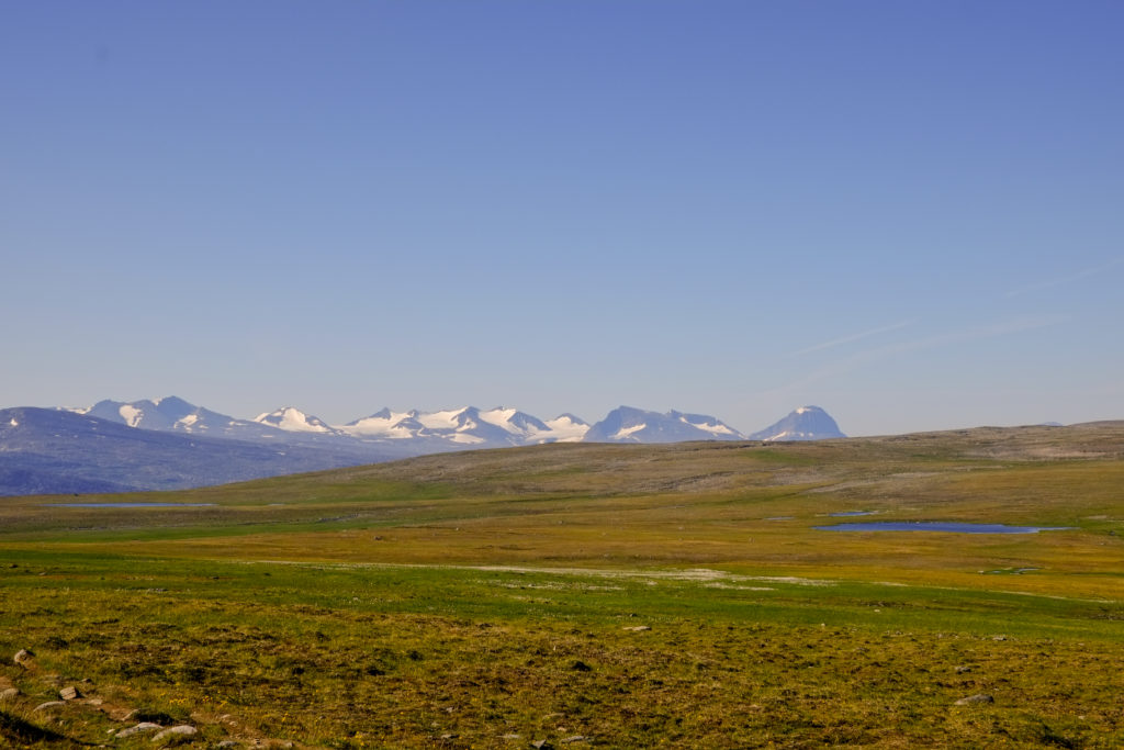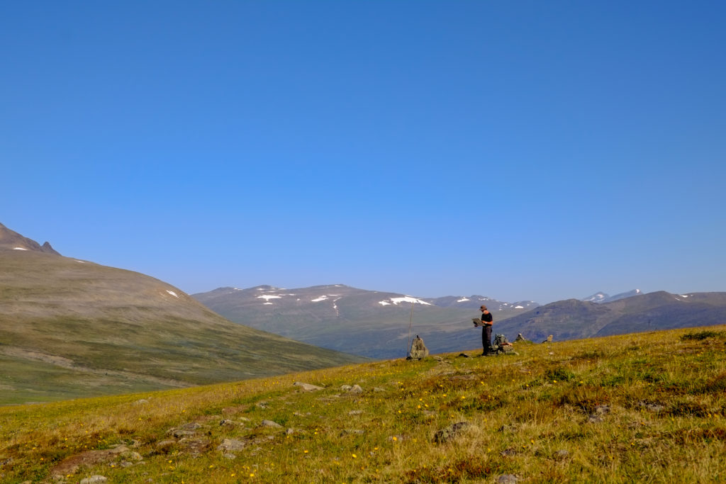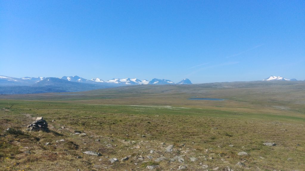 Efter en 1 timme och 45 minuter har vi gått klart de 450 höjdmeterna som sträckts ut över ungefär 8km stig och vi kan konstatera att bådas träning gett resultat då samma stigning tog 3 timmar förra året. Nöjda med oss själva tar vi en ganska utdragen rast på toppen med några ballerinakex vardera och tittar ut över Sarekmassivet som man har fullständig sikt över denna helt klara dag. Riktigt majestätiskt att kunna se 2 av Sveriges 5 högsta berg kramandes med flera toppar på över 1900 meter i samma panoramavy.